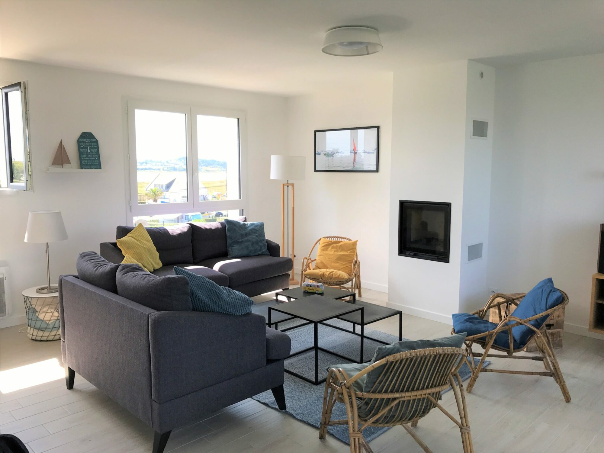 Située au premier étage de votre location saisonnière, la pièce à vivre lumineuse de 45m2 jouit d’une vue sur la mer et sur la baie. Elle comprend le salon, la salle à manger et la cuisine ouverte toute équipée, ainsi que l’accès à la terrasse.